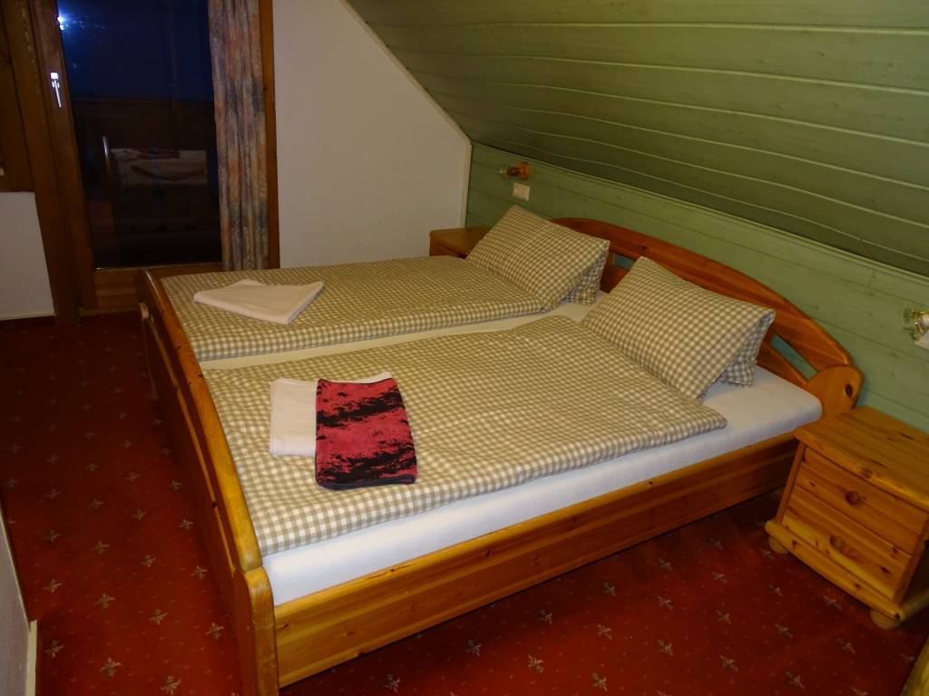 Po vstupu do pokoje budete mít po pravé straně dveře do oddělené koupely. V levé části místnosti, pod zkoseným stropem, je umístěno manželské dvojlůžko a malý stolek. Naproti posteli je vám k dispozici skříň.