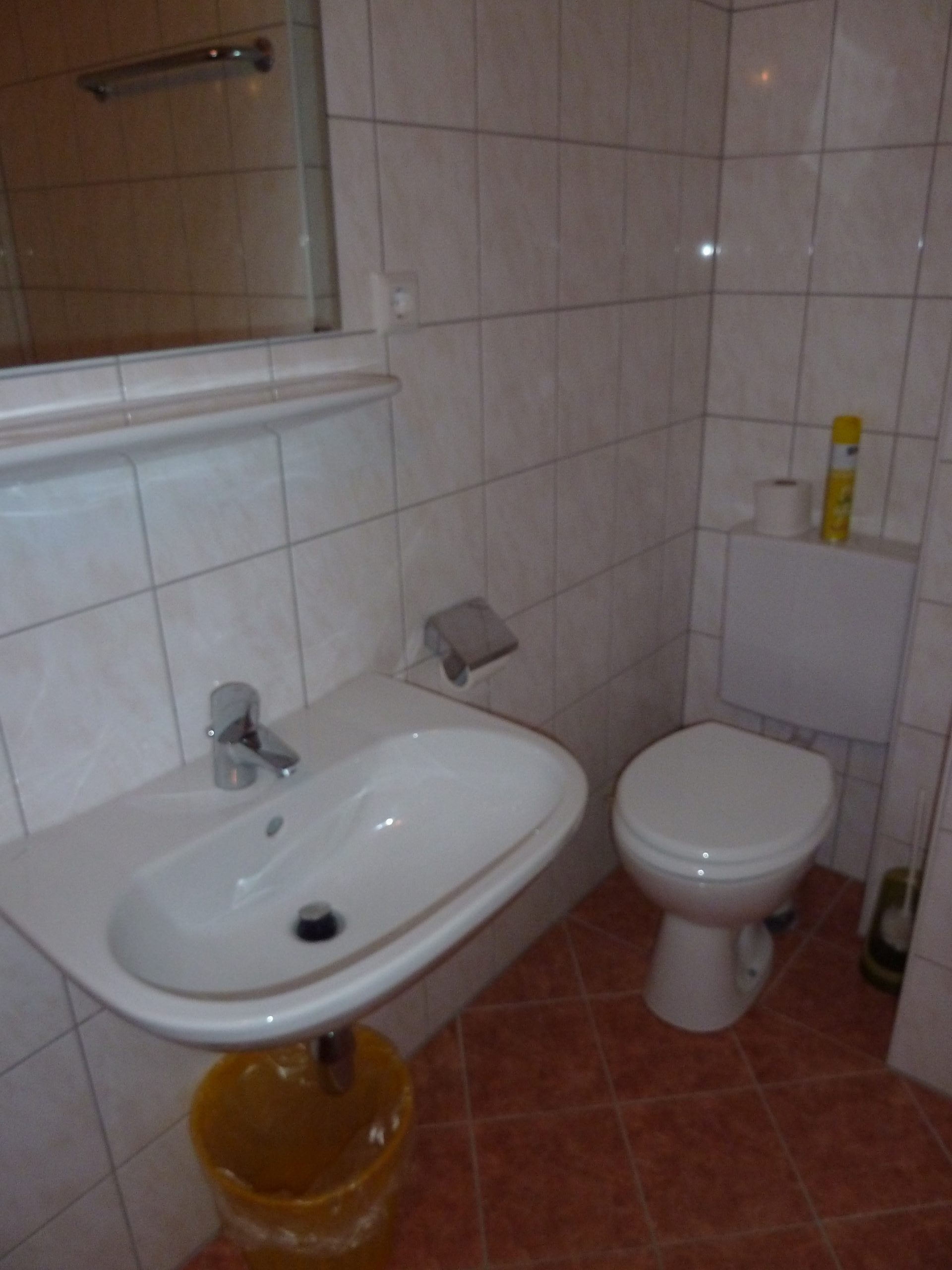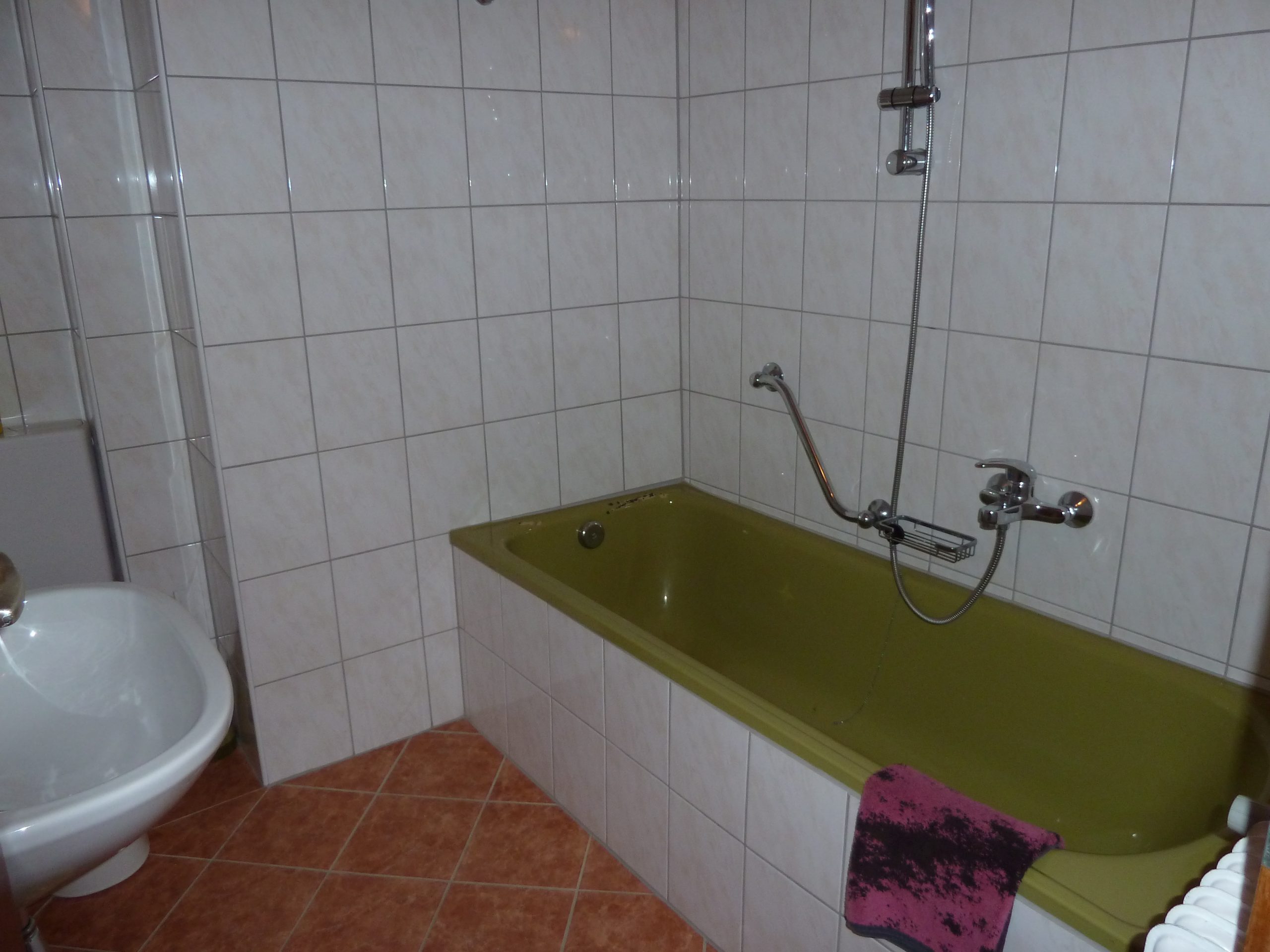 Pokoj taktéž nemá sprchový kout, ale vanu se sprchou. Tu najdete, spolu s WC a umyvadlem, najdete v samostatné místnosti u vchodu.