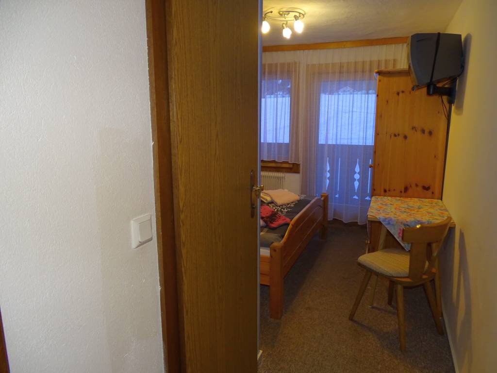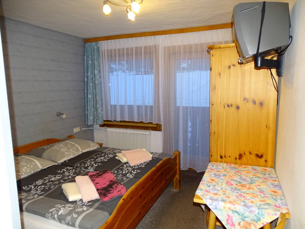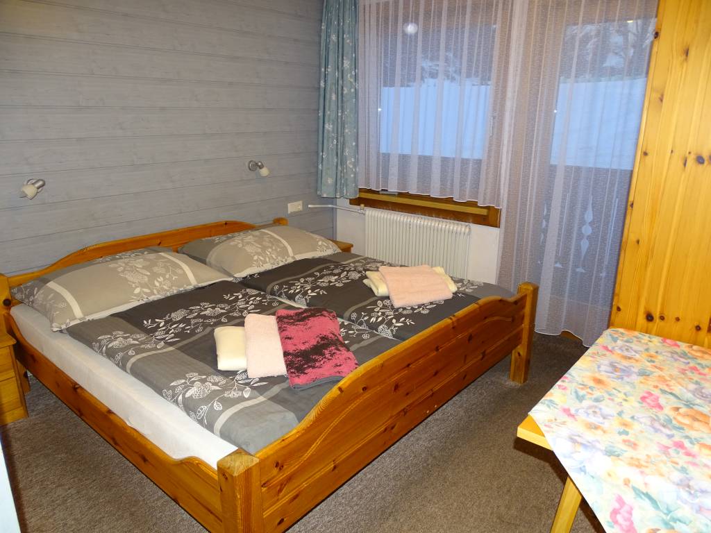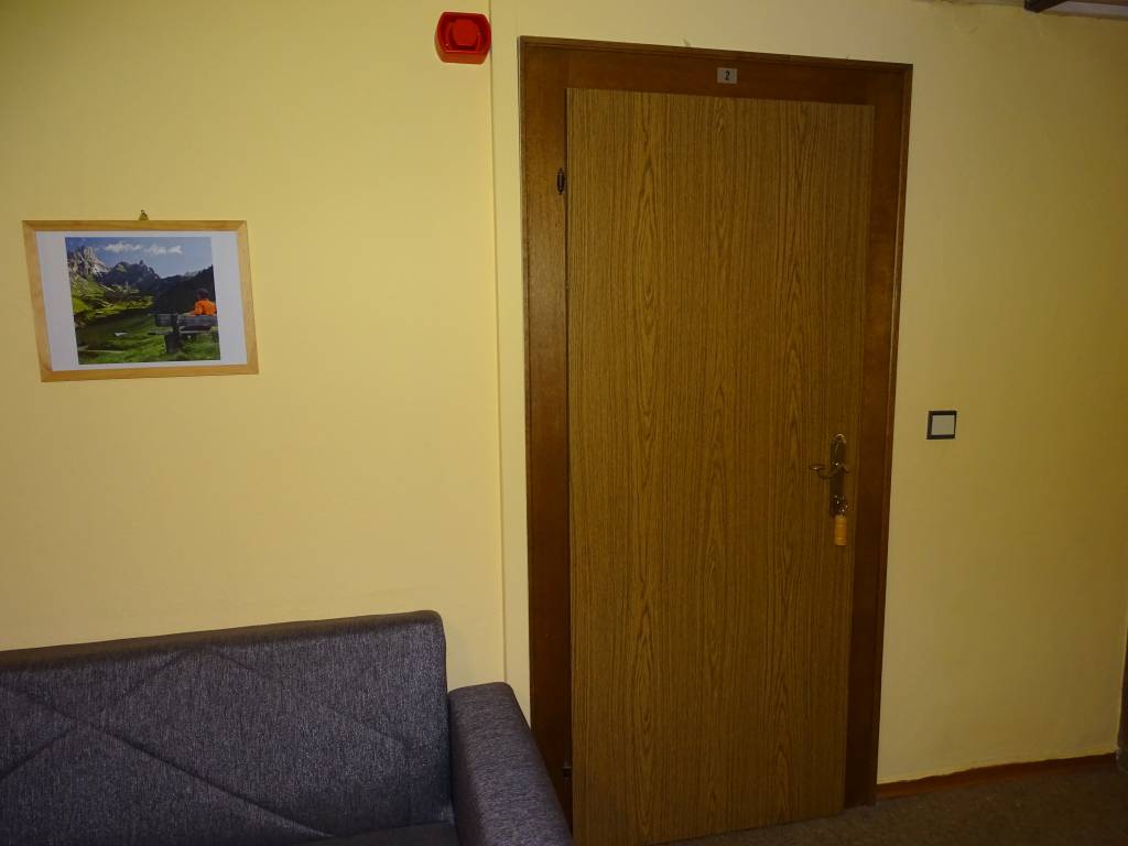 Po vstupu do pokoje budete mít v malé předsíňce po pravé ruce dveře do oddělené koupelny. V levé části pokoje je umístěno manželské lůžko, naproti němu pak skříň a malý stolek.