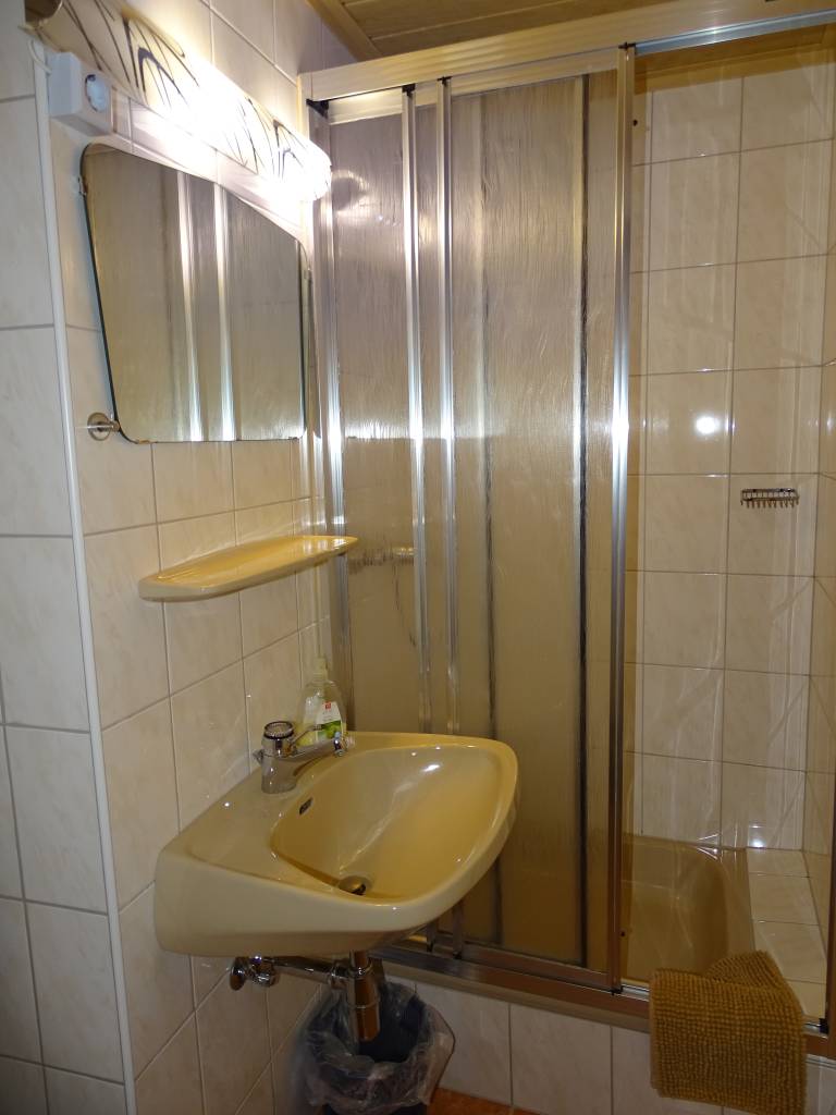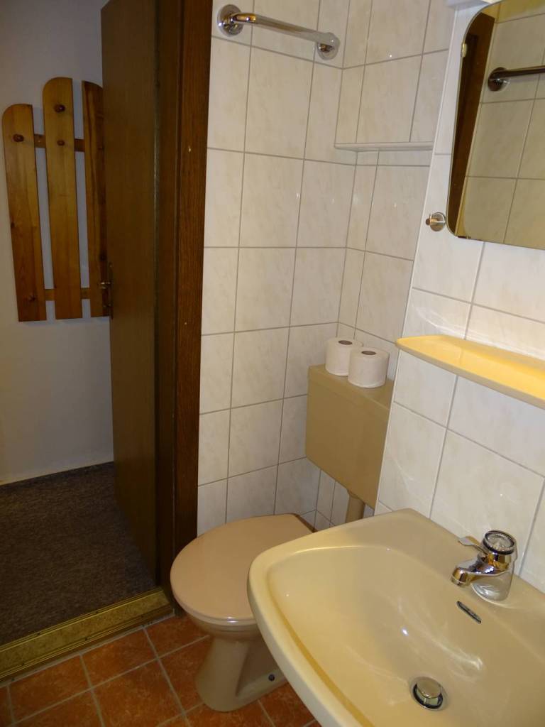 Sprcha, WC a umyvadlo jsou k dispozici v malé místnosti, jež je součástí pokoje.